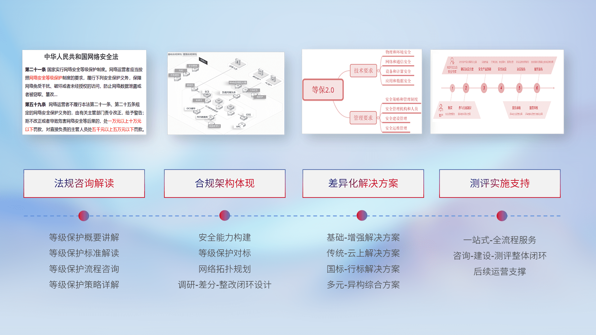 通过专业的法律咨询解读、、、合规架构体现、、、、差异化解决方案、、、测试实施支持等服务,,,,为客户量身打造等保合规体系。。。